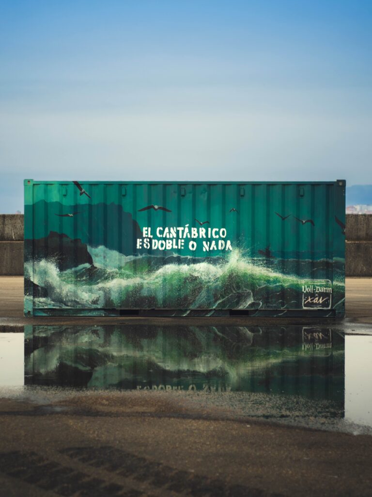· Un contenedor en el puerto de Gijón con el titular “El Cantábrico es Doble o Nada”, creado por Xav.