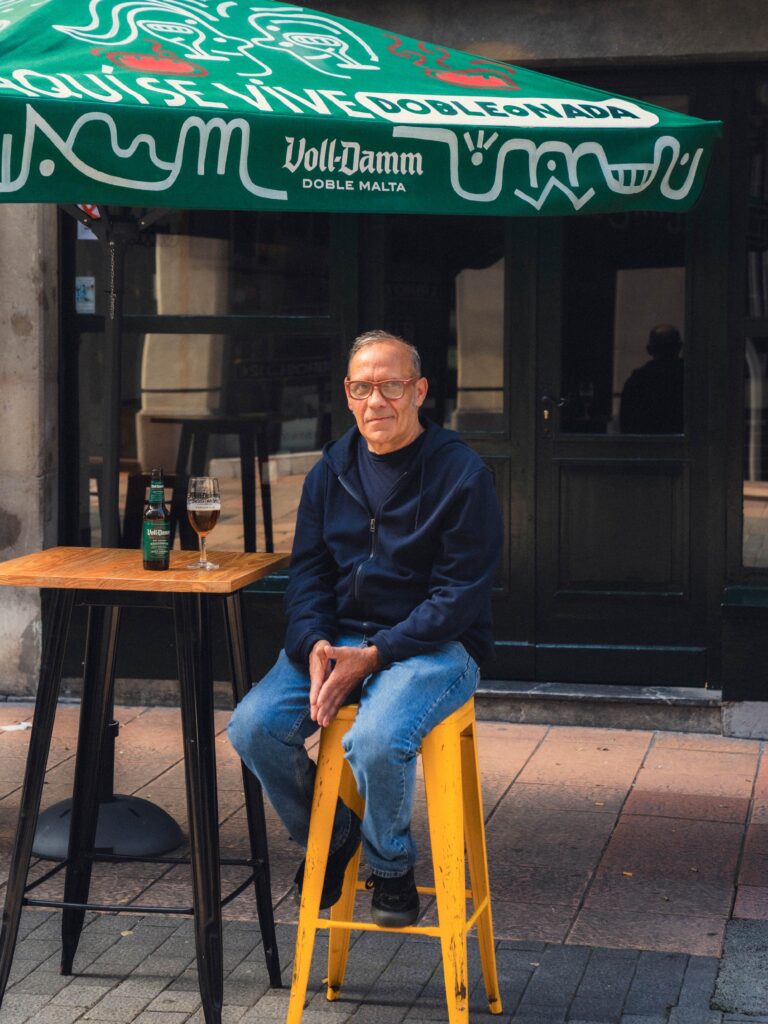 · Dos sombrillas de Voll-Damm en el famoso Bar Montoto con el titular “Aquí se vive Doble o Nada”, ilustradas por Mario Cervero.