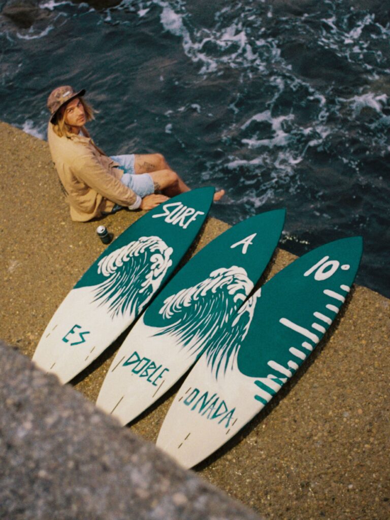 · Tres tablas de surf con el titular “Surf a 10º es Doble o Nada”, ubicadas en la playa de Arnao, realizadas por Iyán Castaño.