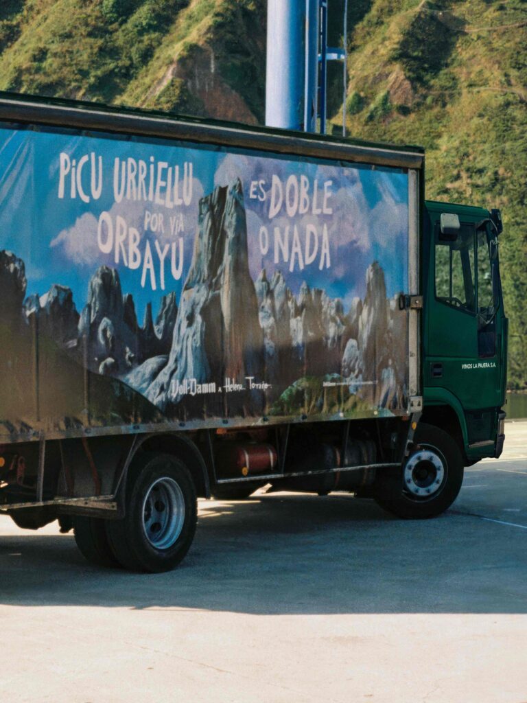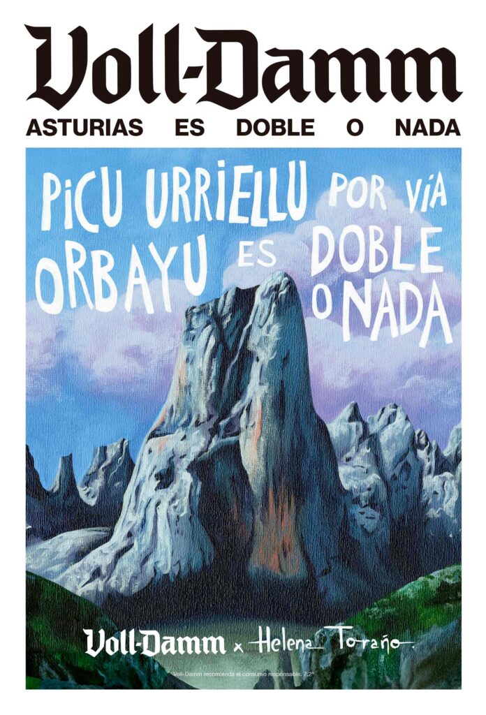 · Un cuadro desde el Mirador Pedro Udaondo que terminó vistiendo un camión de Voll Damm con el titular “Picu Urriellu por Vía Urbayu es Doble o Nada”, pintado por Helena Toraño.