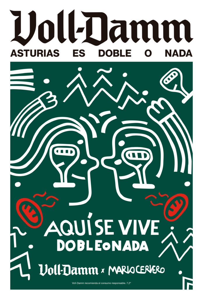 Voll-Damm llegó a Asturias con una campaña que rinde homenaje a la esencia del Principado: su tenacidad, su espíritu libre y su manera de ser, que bien podrían resumirse en una sola expresión: "Doble o Nada". Ser Doble o Nada es ser el norte del norte. Mar en montaña. Trueno y gaita. Covadonga y María Luisa. Es el Carmín, Xiringüelu, La descarga, San Mateo. Folixa y dar el callo. Es azul, gris acero, negro carbón, y, sobre todo, verde. Asturias es Doble o Nada. Como también lo es Voll-Damm quien, desde su origen, ha celebrado su carácter único: una cerveza con el doble de sabor y de fuerza. Una tierra y una cerveza que no admiten medias tintas.