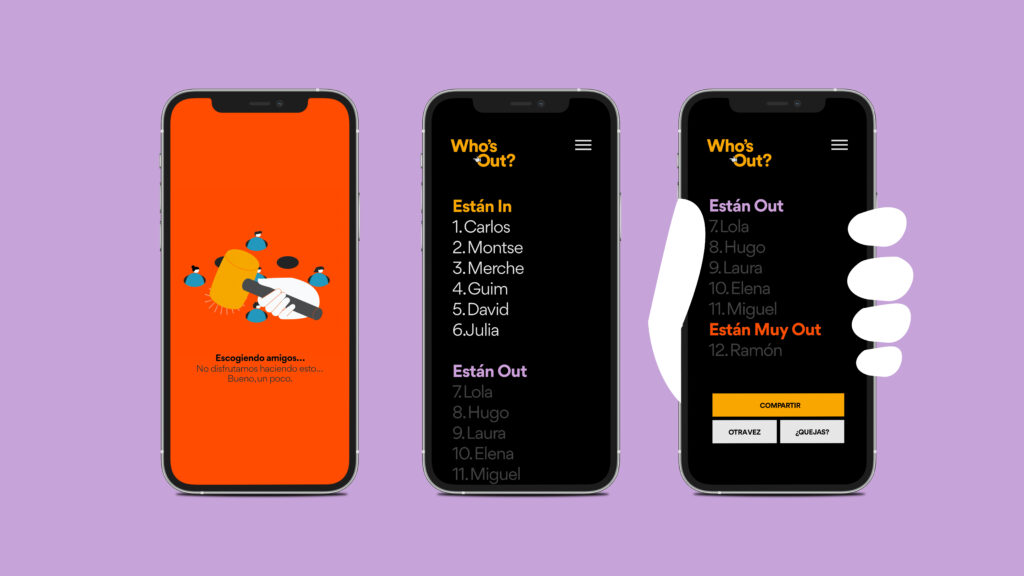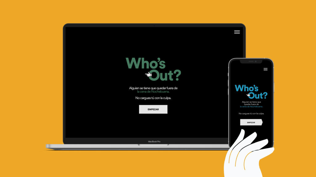 Wunderman Thompson creó Who’s out?, una aplicación web para liberarnos de esa pesada carga. Y es que siempre es más fácil echarle la culpa a un algoritmo que tener que elegir entre amigos y familiares. Se trata de una solución barata, democrática y divertida, para que la gente la utilice y la comparta desde sus grupos de WhatsApp, y así se terminen los debates absurdos y las tensiones innecesarias al tratar de cumplir las normas. Una iniciativa que trata de ayudar a que se respeten las normas de convivencia de una forma divertida.