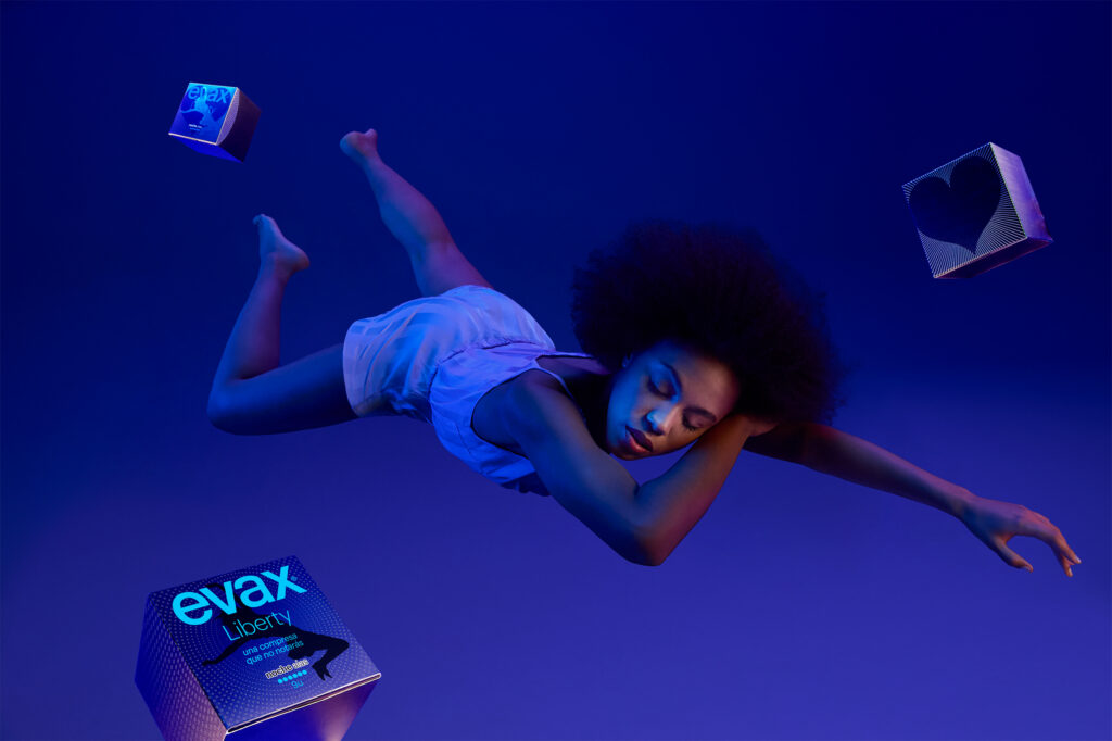 Evax Liberty es una compresa muy diferente a todas los demás. “Es otro mundo”. Y para contarlo utilizamos un key visual muy claro: un mundo ingrávido. Esa visión de un lugar donde todo flota, incluso la protagonista, nos transmite la sensación de ligereza, comodidad y limpieza que buscamos; la sensación de no tener la regla, aunque la tengas. Y refuerza la idea de una compresa revolucionaria completamente diferente a las demás. Pero también quisimos demostrar dicha superioridad y para ello utilizamos una demostración en 3D en la que la compresa flota como el resto de los elementos, y centrándonos en su material, explicamos cómo absorbe, se adapta y elimina el olor.