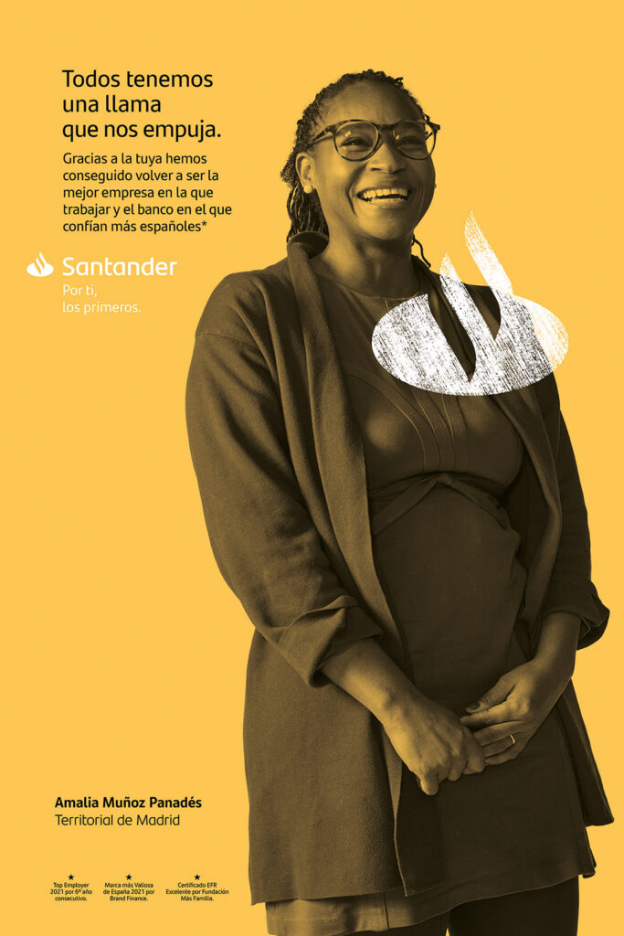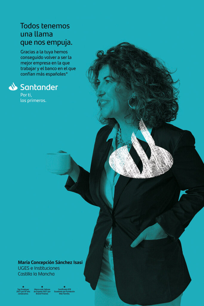 El logo del banco, esa identidad tan conocida y reconocida por todos, fue nuestra fuente de inspiración directa: una llama. Un claro representante de liderazgo, evolución y dinamismo. Un símbolo de energía y pasión que se convirtió también en la nueva actitud y el nuevo compromiso del Banco Santander. Con ella, quisimos representar la llama que llevan dentro los empleados del banco, esa actitud que les da el empuje necesario para poder ser cada día más líderes. Así que, dado que los trabajadores eran el eje central de la campaña, decidimos convertirlos en los protagonistas de todo. Por ello, elegimos a 33 empleados del banco, que se encontraran en diferentes oficinas de toda España, y los fotografiamos. Y con su colaboración formaron parte no solo del spot general de la campaña, sino de los carteles individuales en lo que todos ellos se convirtieron en los verdaderos protagonistas.