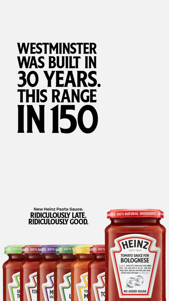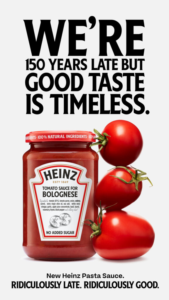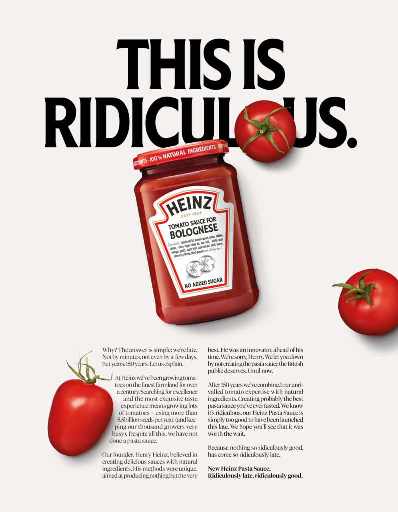 Cuando recibimos el encargo de lanzar la primera salsa para pasta de Heinz en UK, nos dimos cuenta de que todas las marcas de la competencia se encontraban luchando con la misma estrategia. Así que decidimos crear un nuevo storytelling para nuestra salsa, totalmente alejado de los códigos de la categoría. En lugar de centrarnos en sus cualidades o en nuestra extensa experiencia cultivando tomates (que es mucha); decidimos poner el foco en una verdad que era muy notoria por sí misma: llegamos muy, pero que muy tarde, a competir en esta categoría. Así surgió “Ridiculously late. Ridiculously good”, el concepto sobre el que se construyó la plataforma de comunicación de la marca y que, desde entonces, se ha ido enriqueciendo cada año con nuevas ejecuciones.