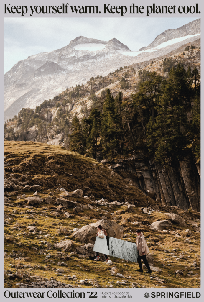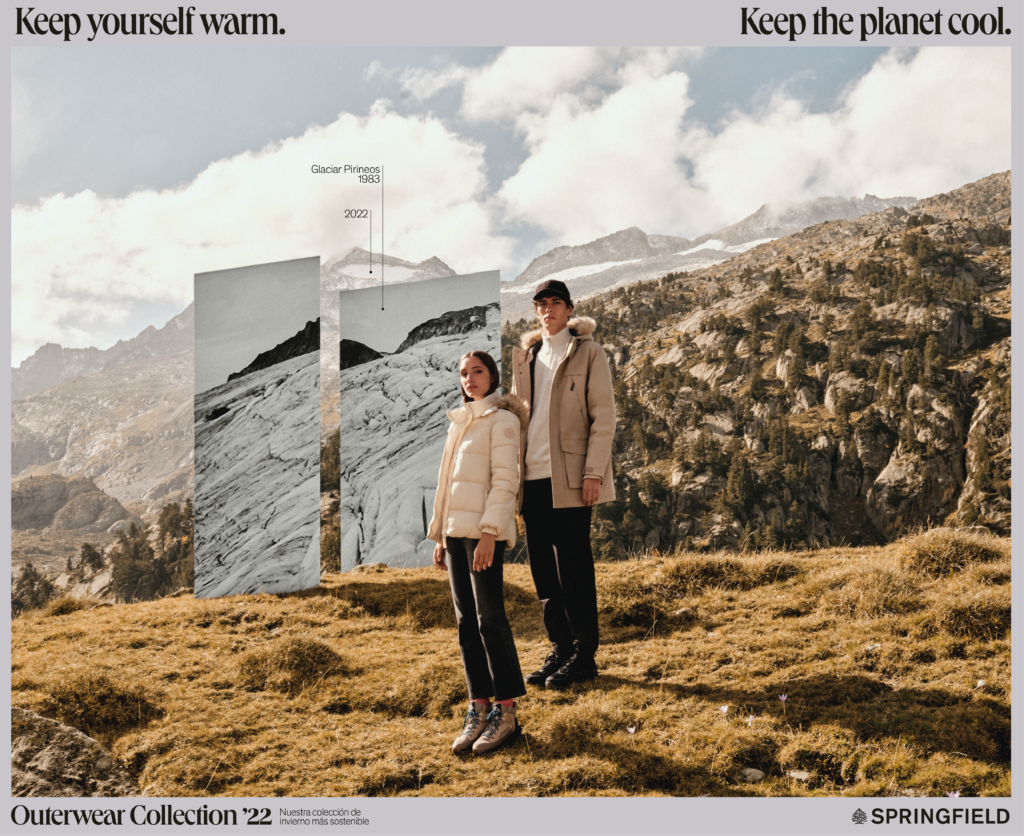 Springfield lanzaba una colección innovadora que protege de la lluvia y viento, siendo además una propuesta sostenible nacida pensando en el planeta. Desde estas prendas respetuosas con nuestro mundo y bajo el concepto “Keep yourself warm and the planet cool”, quisimos contar al consumidor la responsabilidad que asumía la marca e invitarle a compartirla. Y lo hicimos poniendo foco en el calentamiento global, en la desaparición del hielo y de la nieve en lugares en los que deberíamos tenerlos.