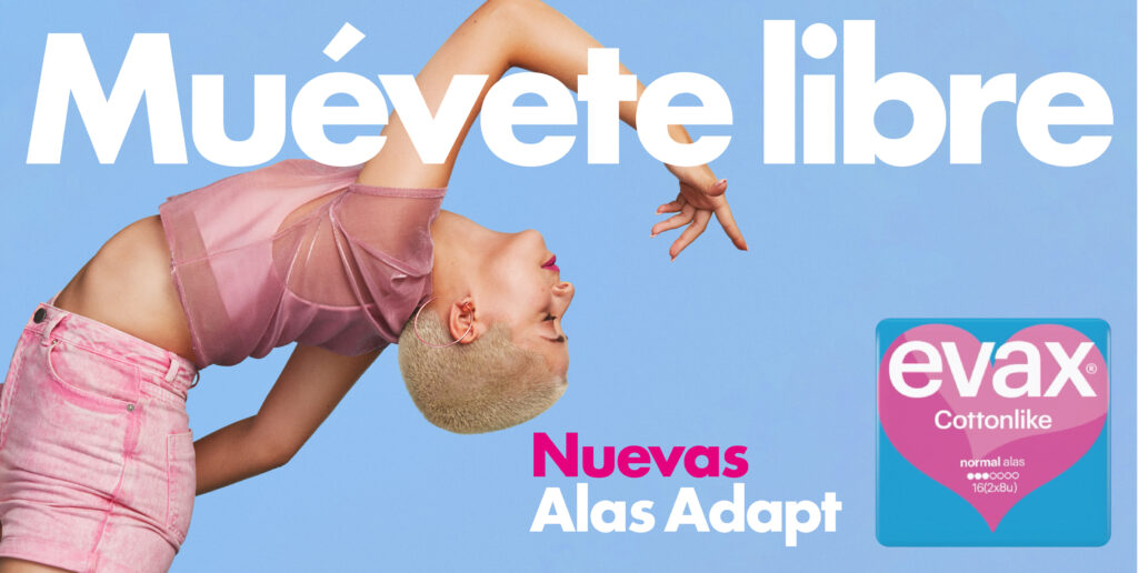 Hablamos desde la diversidad para comunicar la necesidad universal que refleja el concepto de la campaña: “Muévete libre”. Con diferentes bailes y posiciones y en un tono desenfadado, mostramos los beneficios de Evax Cottonlike, una compresa que se adapta a todas las usuarias. A través de la demo comparativa se comunica otra de sus ventajas: la facilidad de quitar las nuevas Alas Adapt de Evax Cottonlike, que no se solapan, ofreciendo así mayor libertad a las mujeres.